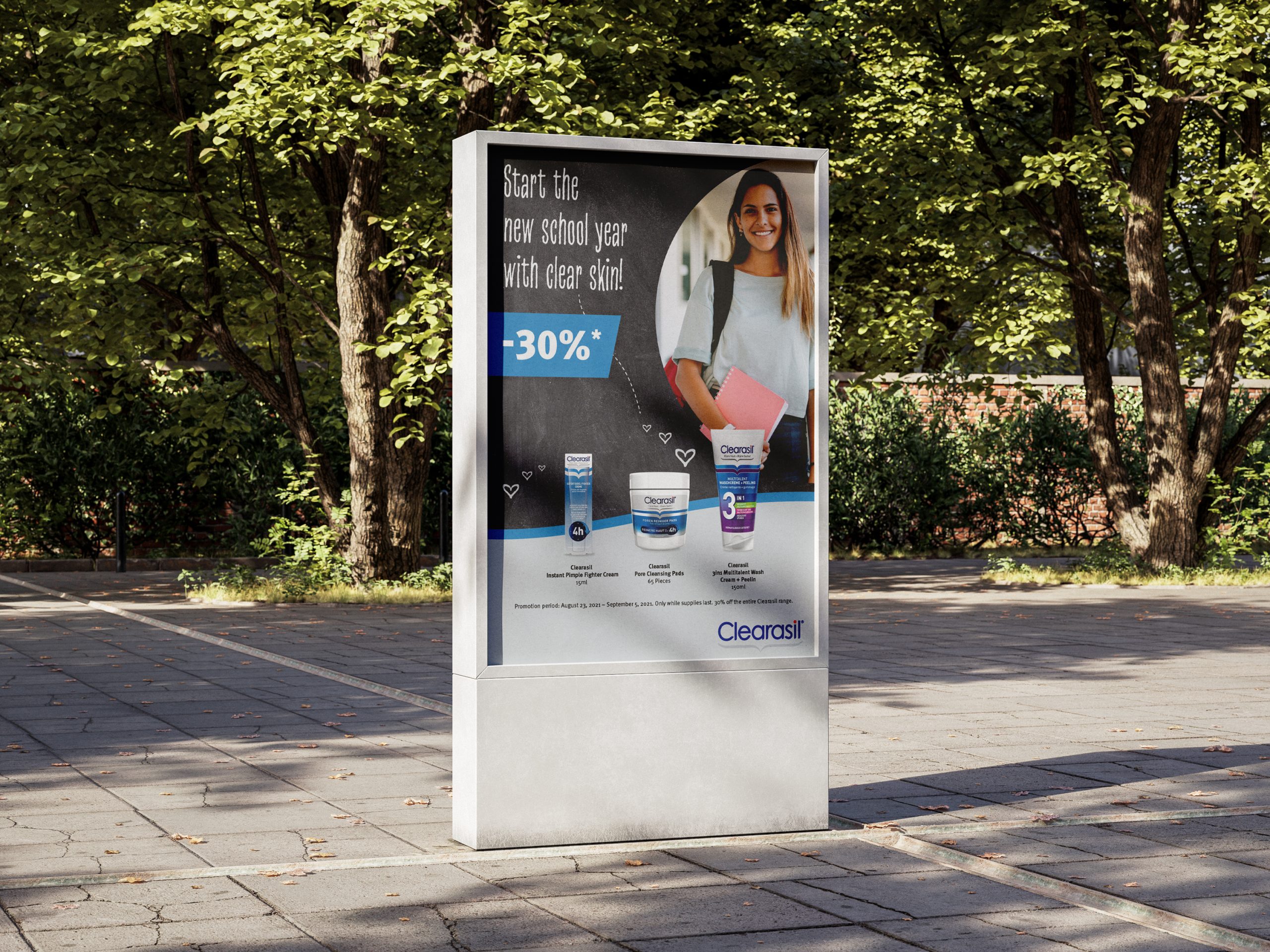 - Billboard: The billboard design emphasized the transformative power of Clearasil by showcasing the headline, “Start the School Year with Clear Skin,” reinforcing the idea that Clearasil products could empower students to feel confident and self-assured. The billboard strategically positioned near schools and high-traffic areas ensured maximum visibility among the target demographic.